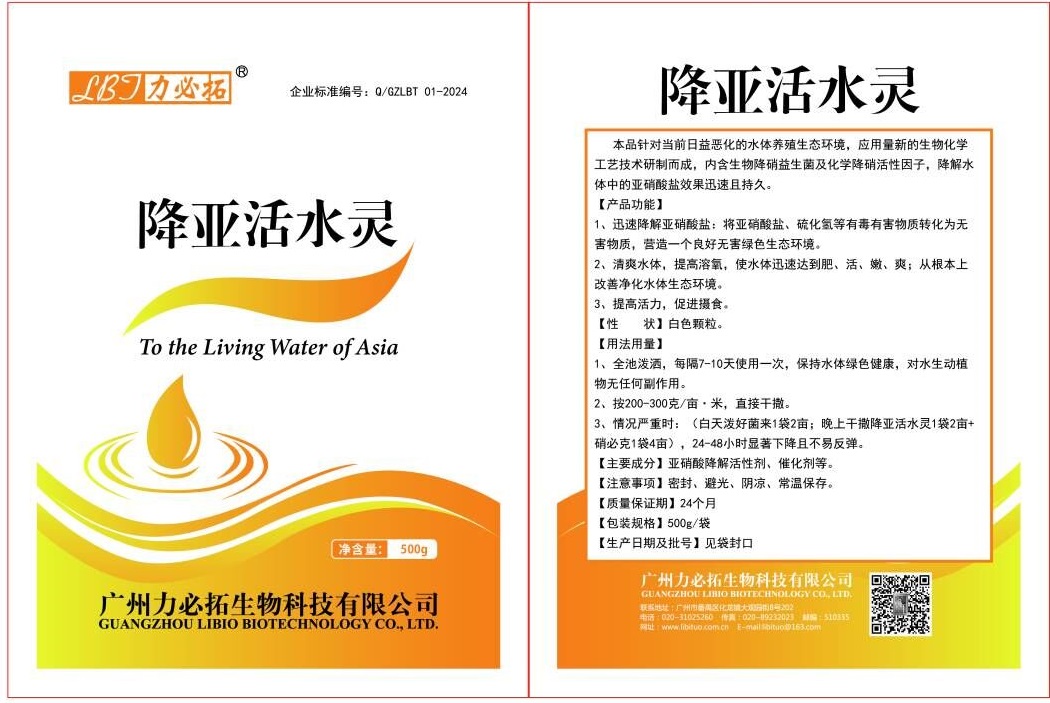 本品针对当前日益恶化的水体养殖生态环境,应用量新的生物化学工艺技术研制而成,内含生物降硝益生菌及化学降硝活性因子,降解水体中的亚硝酸盐效果迅速且持久。